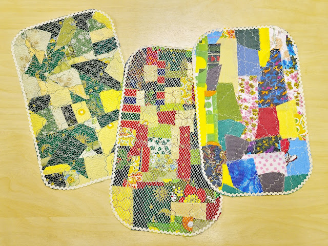 Täna näitasime ette poolikud ja valmis tööd, mis vahepeal kodus tehtud ja jagasime nippe ja näpunäiteid, kuidas midagi teha. Naised on lapitamisega hoogu sattunud, kõik peenikese kribu-krabu saab ka edukalt ära kasutada, nii et prügikasti ei lähe midagi. Kaire näitas ka, kuidas aerosoolliimiga lapitöö kihte ühendatakse.